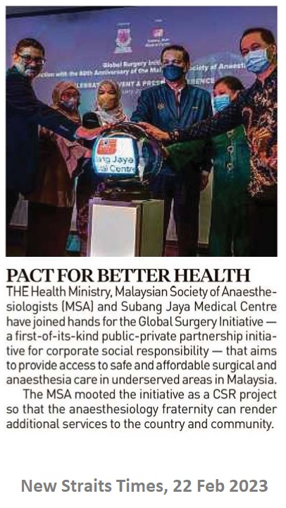 Subang Jaya, Selangor, 15 February 2023 - The Ministry of Health Malaysia (MOH), the Malaysian Society of Anaesthesiologists (MSA) and Subang Jaya Medical Centre (SJMC) joined hands for Global Surgery Initiative (GSI) – a first of its kind Public-Private Partnership initiative for corporate social responsibility that aims to provide access to safe and affordable surgical and anaesthesia care in underserved areas in Malaysia.