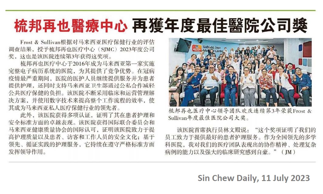 As the leading hospital in the Malaysian private healthcare industry, SJMC has recently been named a finalist for the Flagship Medical Tourism Hospital Programme 2023-2025 by the Malaysia Healthcare Travel Council (MHTC). This further highlights SJMC's commitment to excellence in Malaysian healthcare. With its renowned medical expertise and services, SJMC stands as a trusted ambassador and paragon of excellence in Malaysia's healthcare sector.